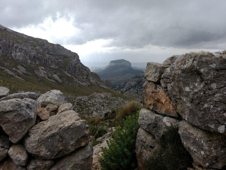 Morning was cool and cloudy. Perfect for finishing off the relentless climb through the barranc. Views became pretty darn spectacular from higher up, out over Sóller to the port and Mediterranean, framed by thousand foot cliffs of streaky limestone. I was hoping for sun at the top, but got wind instead. It was whipping out of the north, carrying a train of sun-blocking clouds. At Coll de l’Ofre I got a face full of the gale, quickly becoming chilled beyond comfort.