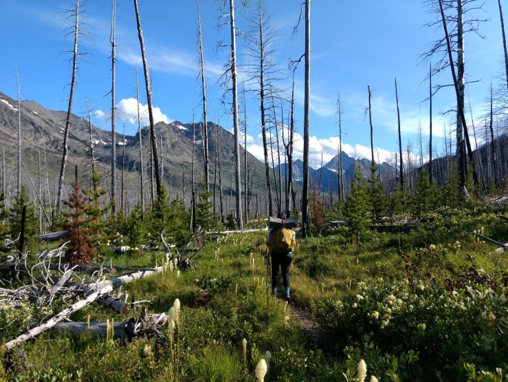 Near the foot of the lake the trail turned south into another burn section to take us up a bulge into another valley, back into the mountains. Afternoon light stretched shadows to the left and made the baby pine trees shimmer. Behind us, the mountains were hazy silhouettes crowned with tufts of cloud. In a see of snags, I stopped to ponder the existence of two healthy trees. I wanted to ask them why they survived when so many others did not. What did they know?