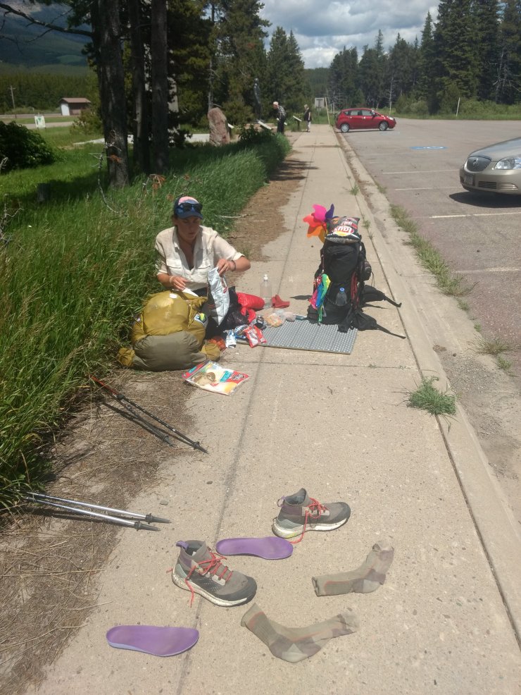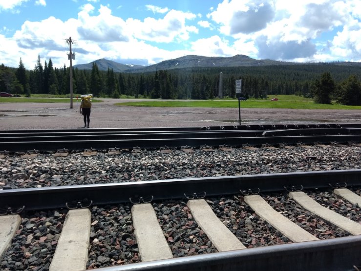 We crossed the tracks and the road to reach the rest area that boasted at least five educational signs and one obelisk detailing the important history, people, and geology of the area. The view of the great escarpment of layered stone that forms the southern border of Glacier NP was worth one more informational board at least! Spice and I joined two other hikers sitting in the sunny parking lot to eat lunch. They’re new to us, true SOBOs, kids who just finished high school, one getting off trail to diagnose intense foot pain. Their ride came to collect them, leaving just us to dehydrate in the heat.