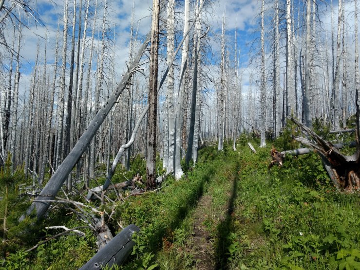Easy walking through meadows and forest put us in a huge burn area. Views of the surrounding hills were nice, but the scale of the devastation was enormous, especially apparent because all of the hills within sight were also covered in a prickly coat of silver snags. A big fire, whenever it was.