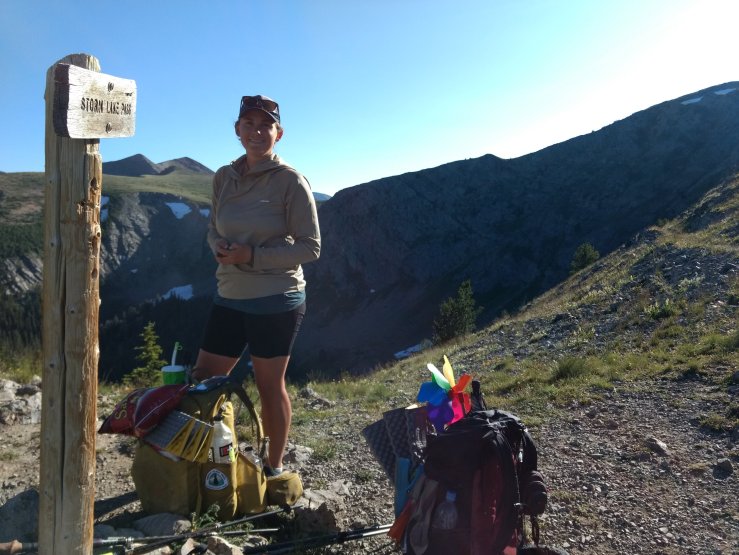 We finally caught a breeze and a short rest at the top of a super steep climb out of the trees and into a field of fragrant lupine. Their smell reminded me of those purple scented markers from my childhood. From there we decided to bushwhack about half a mile in order to cut off a lightbulb of trail around Stormy Lake. In the end, I made some pretty shoddy work of it so I don’t think we saved much time, but it was a fun way to test our ankle strength. Covered in spiderwebs and back on trail, we turned uphill to finish the climb to Stormy Lake Pass.