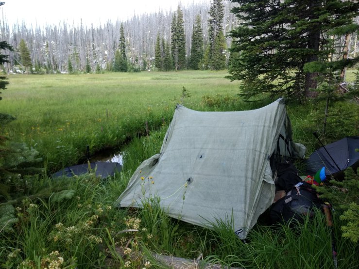 Sunset was turning the horizon orange and making the bear grass glow when we finally made it to camp. We pulled water from the coolest spring I’ve ever visited, a steady stream flowing from a small hollow in a grassy slope. While I filtered, Spice set up camp and unpacked my stuff, again overwhelming me with her compassion and kindness. I collapsed in the tent, ready to sleep off this pain after scarfing down my cold ramen. What a day.