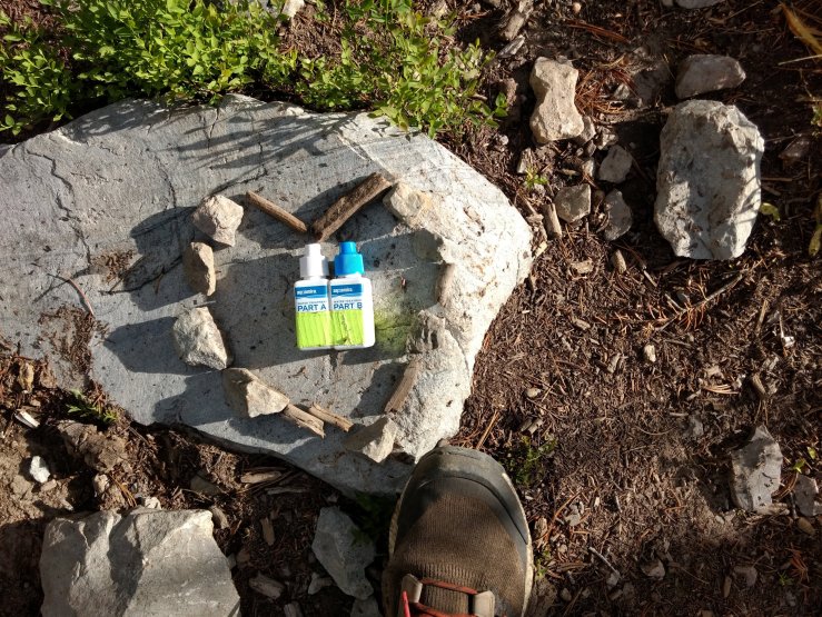 Down and around the snout of the moraine through a meadow bordered by trees. At the next big creek I was relieved to find evidence that Spice had been there, her bottles of Aquamira waited for me in a heart of pebbles (my filter broke, remember?). I washed my salty shirt and treated a liter of water.