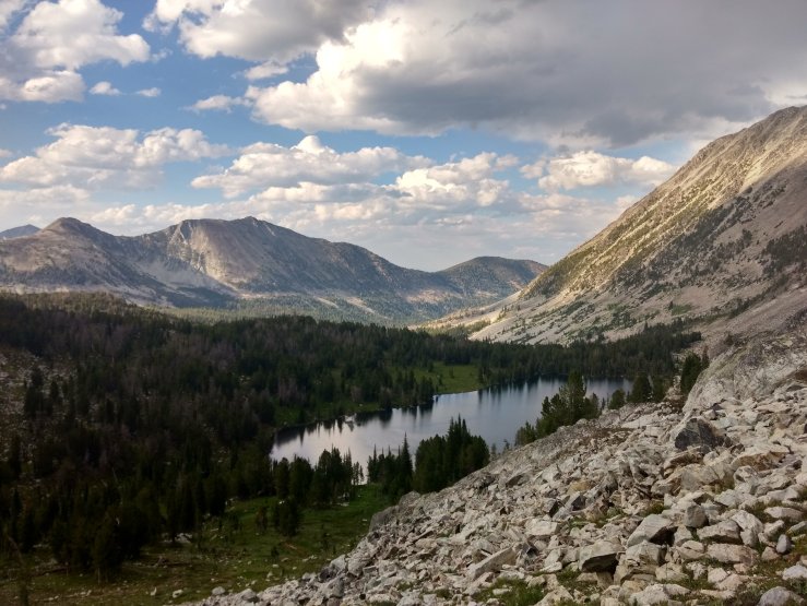 We switched from shady side to sunny bowl shortly thereafter. I was feeling fine and couldn’t get over how quickly the scenery had changed on me. We were now back in the mountains and I felt like we always had been somehow, even though the last big peaks, the high Anaconda-Pintlers were days behind us. Green meadows, Alpine lakes, chutes of granite scree and boulders swooping up to bald peaks. My kind of place.