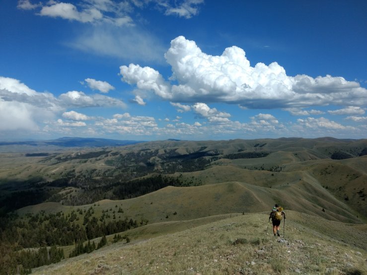 The sun was high and warm by the time SpiceRack and I left the overlook where we had camped. We made quick work of the final climb to a pass thing, then dropped down a wide ridge into the world of cow pastures and cow pies below. Spread ahead of us to the east was a scene of crumpled earth. Grassy ridges and fingers rose steeply to the Divide, which meandered up and over numerous high points. I knew we were going up there. It was going to be great. It was going to be hard.