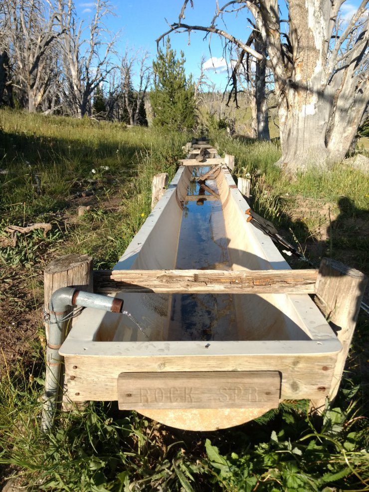 We discovered where all the white cows have been hiding, then followed a fence for a long while. Steep up followed a steep down through trees. We laughed at the overabundance of CDT trail crests nailed to a tree every 20 yards through a Disneyland stretch of trail. After filling our bottles at Rock Spring, cool and clear from a pipe, Spice and I struck out into the golden evening light to make a few more miles before camping.