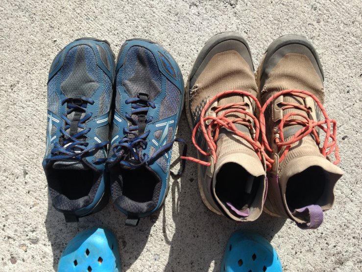 We slept in, waking naturally with the sun. There was a box waiting for us at the post office so we had an excuse to lounge around, drinking coffee and eating leftovers, sitting in the rocking chairs while admiring the neat architecture of the Old Faithful Inn. Then to the PO at 9am. New shoes and socks for me. Some bits of clothing for SpiceRack. Trail Christmas. I felt bad pulling the laces and throwing away my old shoes. I hiked over 900 miles on those guys, more than any other pair of shoes that I’ve owned. They were done though, packed out, worn down, and stinkier than a pile of cheese left in the hot sun for a day. Time for a fresh pair.