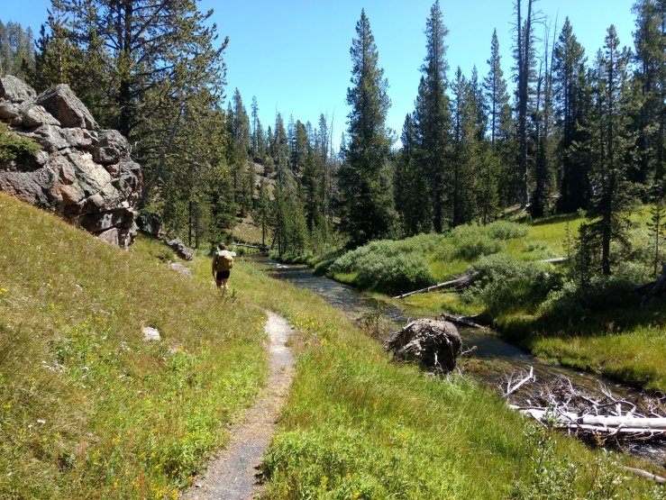 We finally got hiking at 10am, walking out of the parking lot and across the road, into the trees. We needed to make it to Grant Village, 25 miles and a hitch away if we wanted to camp legally tonight, so we boogied as well as we could.