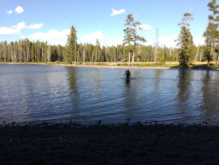 Flat hiking and a break along the Shoshone Creek. Then we sloshed through knee-deep muck around the shores of Shoshone Lake. Each step brought the question of “how deep and I gonna go?” Rumor had it that there were leeches hanging out in there, but I’m skeptical. We didn’t hang around though, and slapped away looking for clean water to splash through.