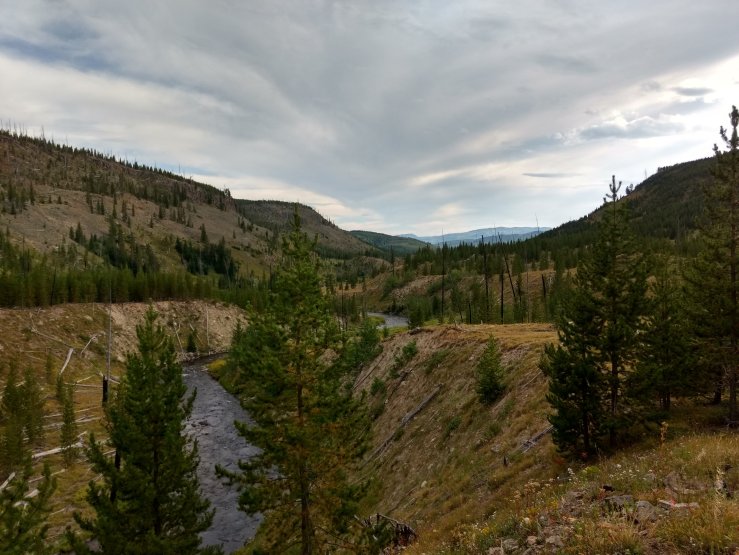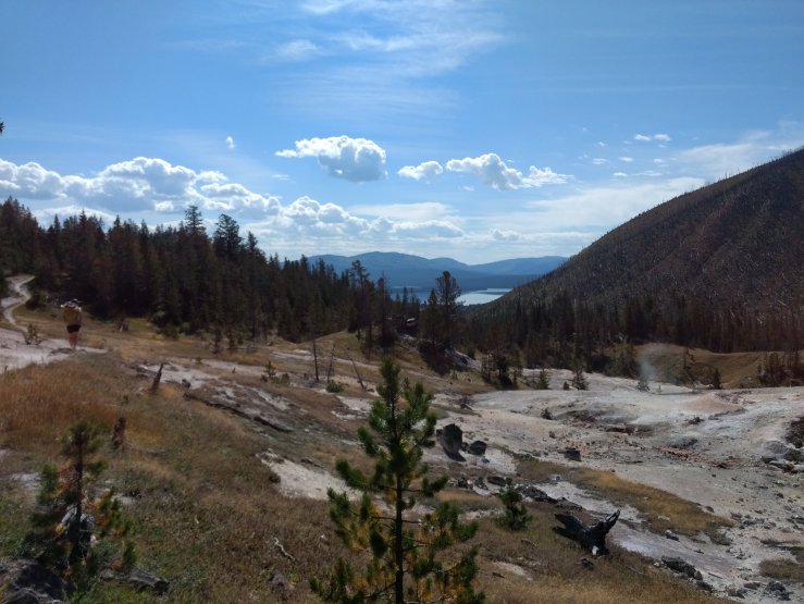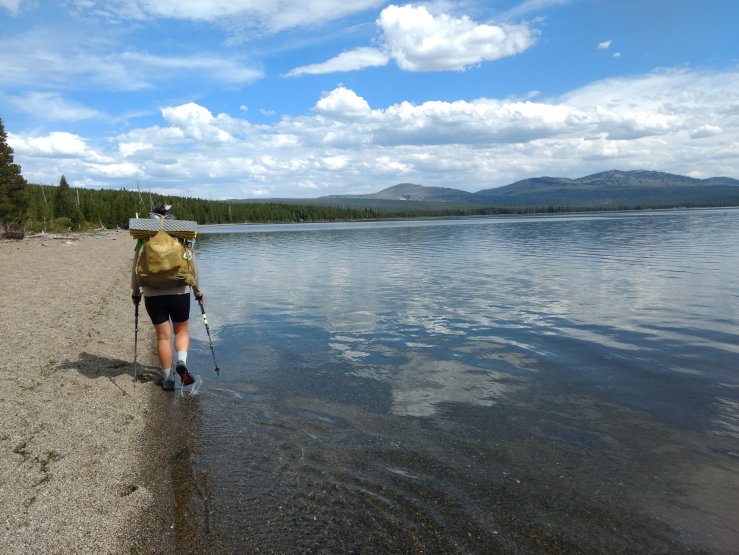 It wasn’t far to the next break on the gravel/sand shore of Heart Lake. I went for a quick dip to cool off, then joined Spice in the shade of a large pine for lunch and more laying. I considered my time so far in Yellowstone. Beyond my expectations, is what I have to say, even having visited before. Big lakes, flowing rivers, the always intriguing thermal features, and constant threat of seeing an animal bigger than me have made it a profound place through which to meander. No mountains, but it feels wild once away from the boardwalks and parking lots.