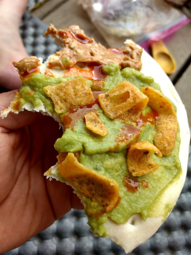 A big storm rumbled as Spice and I sat on the porch eating pb, guac, Frito, and hot sauce pitas. The new shade was welcome. With a few mosquitos about, we learned a new game, Blood or Hot Sauce.