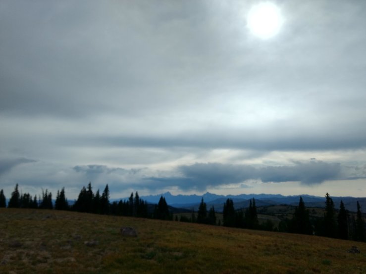 My energy waned, so Spice dragged me up and down a few big climbs, but at the top of the last one, above 10k ft, the views gave me all the energy I needed. The world opened up all around as we crested a wide plateau. The Tetons, my goodness, they looked good. The sky was still stormy and the mountains barely more than a silhouette with a golden glow outlining the sharp jags. A few hazy glaciers provided a little structure. Some new, unexpected cliffy things rose sharply to the south. We found shelter from the wind and took an obligatory vista-break to absorb the glory.