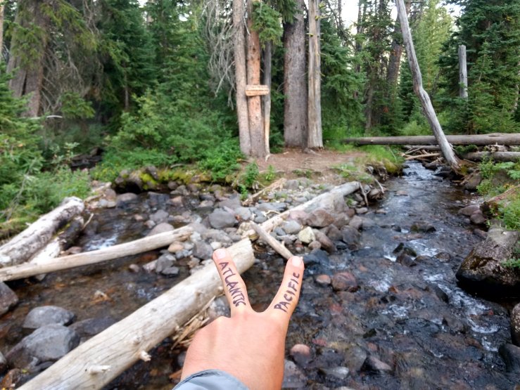 That was a cool spot, but just a few miles later, we reached arguably one cooler. This was the Parting of the Waters, where a creek splits in half across the Divide, the left side flowing to the Atlantic and the right to the Pacific. An old wooden sign pegged to a tree made it official. Spice and I each stood straddling the separating flow, one foot in each ocean. Maybe it doesn’t sound all too impressive — I know that I wasn’t expecting much — but standing there was kind of awesome.