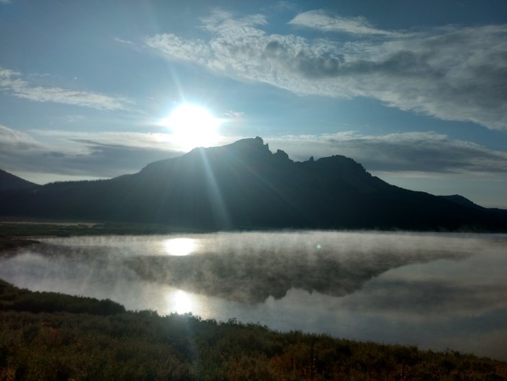 The crocs gave me some surprisingly good walking for the easy, 3 mile cruise on horse trail to Brooks Lake Lodge. I kept my hands in my pockets except to feed myself granola from a bag. The big, layered cliffs encircled the big lake and lit up fantastically in the morning light. Mist danced and flowed across the surface of the lake. I was entranced. But I also had to poop really bad, so I hoofed it to the campground to make use of the well-kept privy.