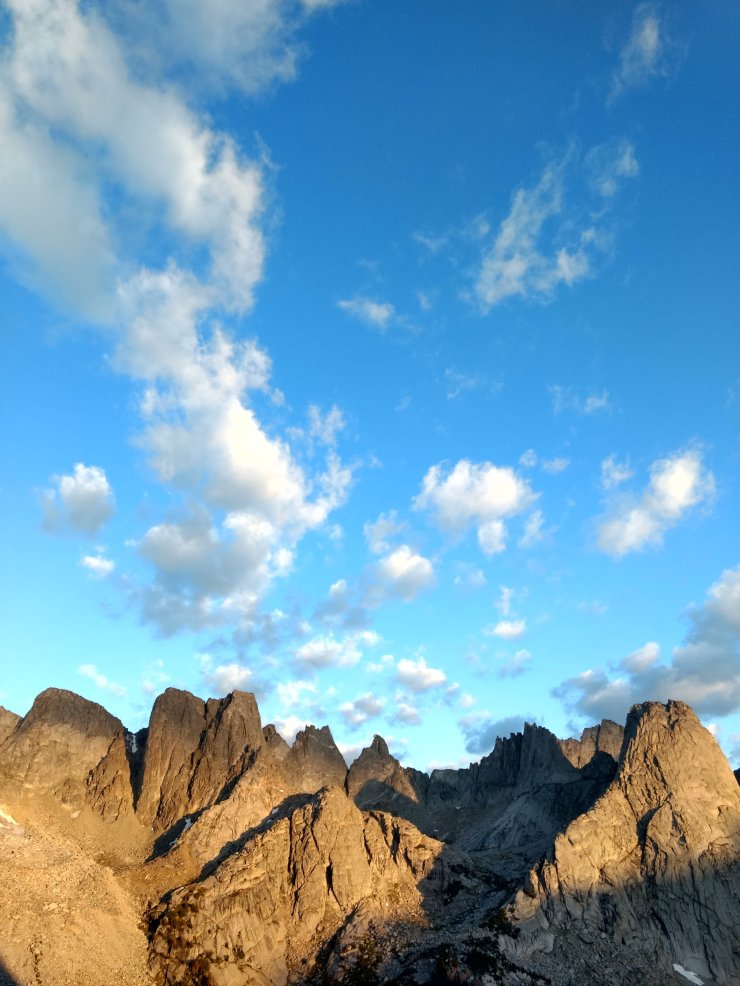 I slept well, toasty and unmoving, above the pass, waking naturally with the brightening sky in time to pack up camp before the light show began. I munched on cookies for breakfast as I watched pink alpenglow flow down the tower faces, while brightening to a vibrant orange. The detail in the featured cliffs and contrast with the blue sky were superb. I felt like a small dot in the middle of an uncaring universe. I was there to observe, but had no influence on the unfolding scene. It would be there even if I was not. For this reason, I was grateful to be where I was, somehow after an entire lifetime of twists and turns, in this spot at this time, watching.