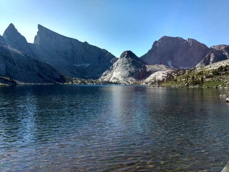 The sunrise put me a little behind, so I wasted little time once on the trail. I left the Cirque behind and dropped down to Big Sandy Lake. Tendrils of smoke rose from numerous campfires, colorful dots stirred below. After a sock wash and water break, I climbed first to Clear Lake, then up fun granite slabs to Deep Lake. Another panorama of sheer granite greeted me there. I took the opportunity to go for a dip, and although I harbor no regrets, it was too cold for enjoyment. I had to do it, though. Too beautiful.