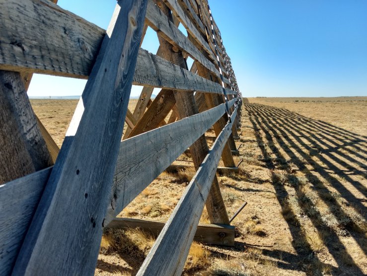 As the day heated up I became grateful for my early start. It was going to be a hot one for sure. I gazed ahead at the open desert, my road clearly visible many miles away. This is my life now. I miss the mountains. No breaks. I felt an intense urgency to reach Atlantic City, though realistically there wasn’t much I could offer Spice except my support. A cool snow fence distracted me briefly before crossing Hwy 28. Three miles to South Pass City. Seven to Atlantic City.