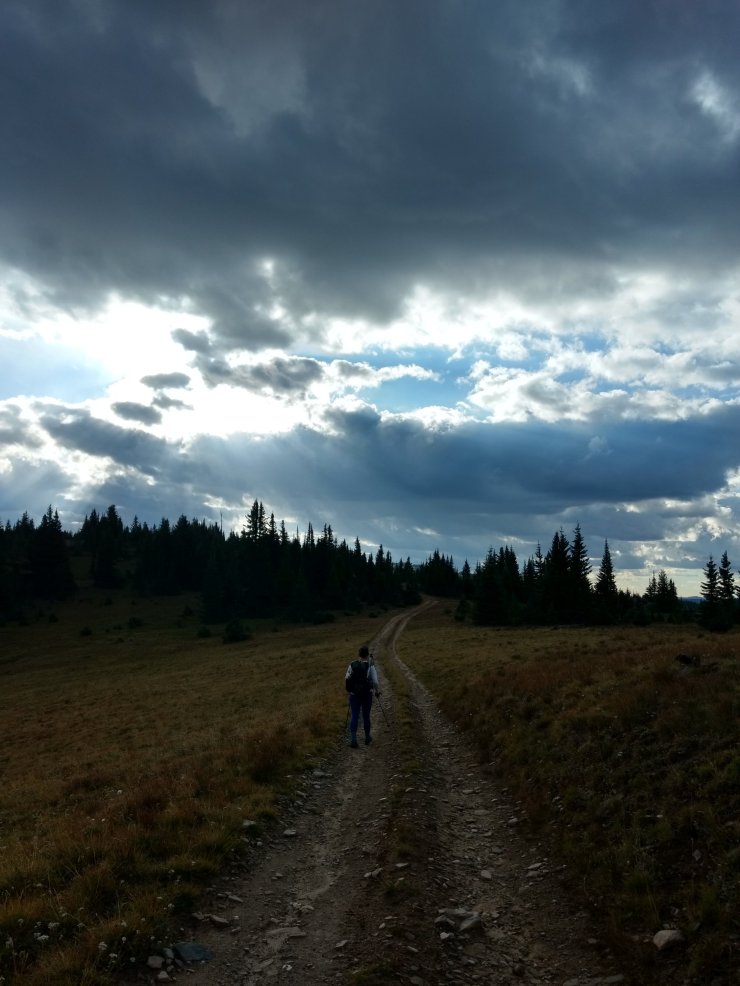 The sun was already poking through the trees when we got moving a little after 7am. A dirt road took us on a rollercoaster ride up a ridge, steeply at times, until the occasional bald spot afforded us views north back into the desert basin, or south into mountainous Colorado. It’s in view now. Not far away at all. My stubbed toe felt like garbage, forcing me to limp a little, but I was feeling too good about leaving Wyoming behind to give it much thought. Just another minor pain of the trail.