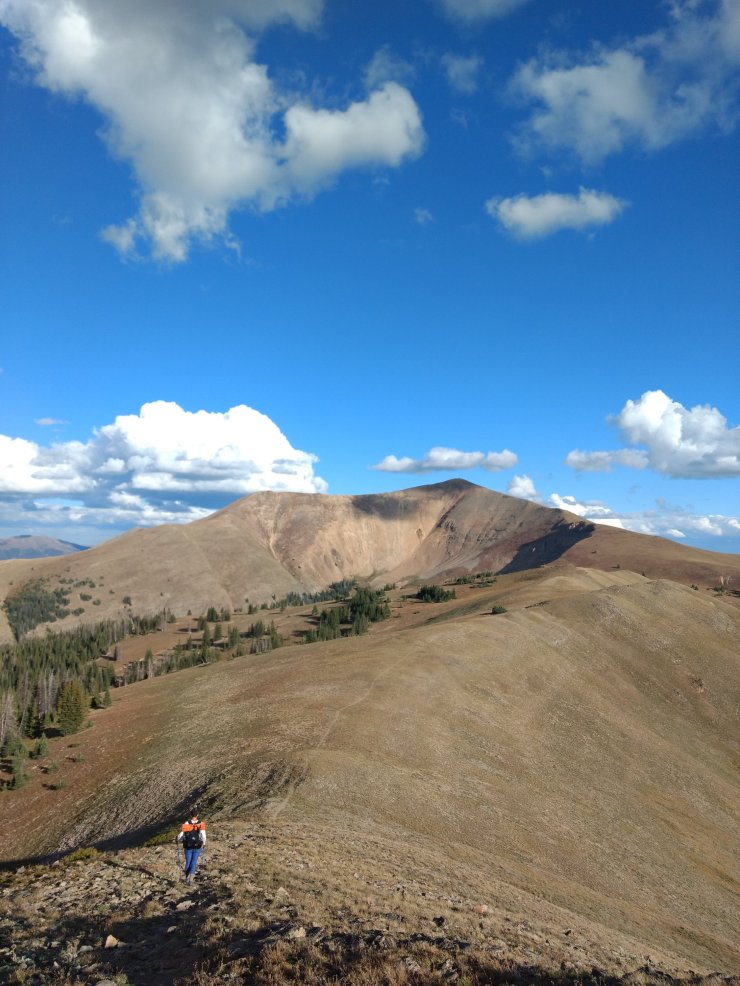 I felt strong on the 1,000ft climb to the next ridge, then chasing Spice along it, up and down over steep lumps. The hiking was tough, but a fun challenge that I really enjoyed. The views were great the whole way, which made the effort worth it and reminded me what hiking the CDT is really all about. I would crest a local hump then scan my gaze along the trail ahead to find a miniature Spice traversing and open slope a mile away. Several minutes later I’d be right there, and doing it all over again. Fun stuff.