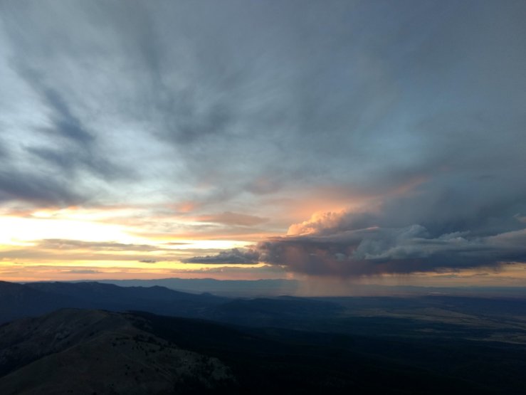 There was an old lookout shack where we hunkered to get out of the wind. Spice cooked some ramen, I ate a Clif bar or two. When we finally got our butts moving again 30 minutes later, sunset was in full swing, casting pinks and purples all around. A large cloud dumped rain on the town to the north and glowing virga surrounded us. Amazing. I wouldn’t have chosen a different time to be there.