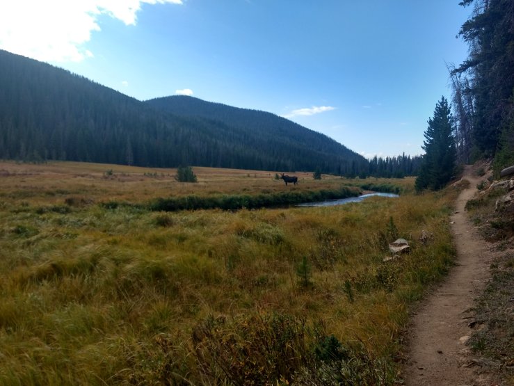 We got moving out of our stealth camping spot at sunrise around 6:30am. I made coffee using the hot water from the public restroom and instant coffee packets. Spice wasn’t having any of that and went to the bakery when it opened for the real stuff. We walked down the main street out of town with our thumbs out, but couldn’t catch a ride until we made it to Hwy 34. I guess we just looked a little too ragged for the touristy folk. Our ride was from a cool local SUP instructor and he dropped us off at the Green Mountain trailhead. I said goodbye to Spice so she could get moving on her 25 mile day, then ran a quarter mile up the highway to the spot we caught a ride yesterday in order to link my footsteps. By 9am I was headed up the trail, past numerous dayhikers looking for morning moose.