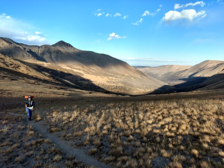 Bald slopes of the high country came back into view for the first time in days at the head of the valley. We kept on going, headed that way. A big hunting camp at a trailhead with a toilet, then a mile further to a creek for lunch. We were all wondering where the heck Crunchberry was by now and we found him backtracking to meet up. He’d had a confusing morning, thinking that Spice and I were ahead of him. Shhhh, Crunch, it’s alright now. We’re here.