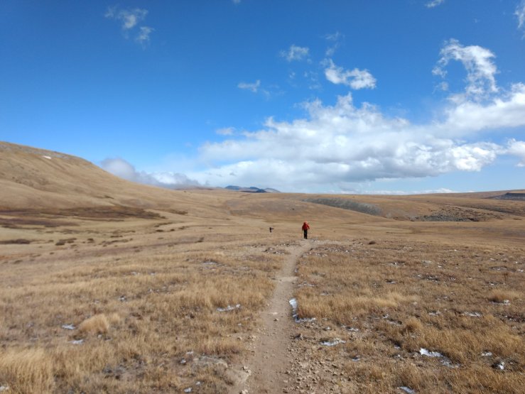 It was just about all downhill from there, literally and figuratively. Down to and then across Snow Mesa, four miles of undulating tundra. We stopped at a creek for a mental reset and water fill-up. None of us were properly hydrated. Glad to be done with that snow, but man, that was awesome! I don’t think my enthusiasm was totally matched, but Spice and Rooster were equally happy to be in the sun, just a short distance from town.