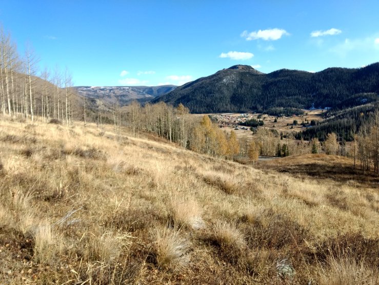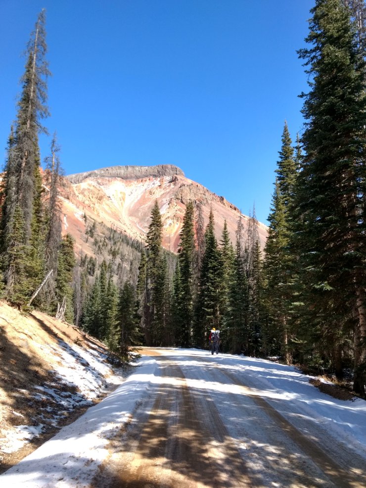 The snow, ice, and danger gradually melted away as we dropped in elevation. Gronk played podcasts and music the whole way down to some river and we had an almost warm lunch along it. Then it was up and over to the next valley. I hiked in my fleece and gloves, unheard of for consistent uphill, which usually gets me sweating without fail, but this day was exceptionally cold. However, it was good walking all the way to the small town of Platoro, all but abandoned for the season. If Spice’s shoulder bothered her, she didn’t show it.