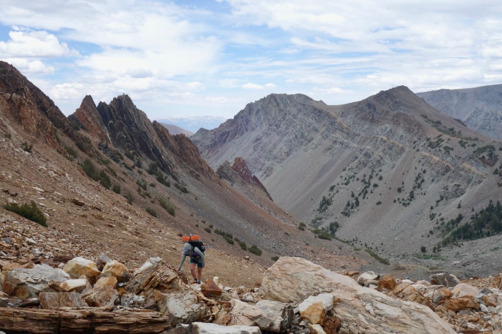 Clouds built overhead as we continued up. We stayed high and to the right when we should have stayed low and up the middle. This small error was easily corrected, and it was probably only the first of many headed our way. At the base of a vertical point of a mountain, we took a right to follow the source of Horse Creek where it rushed invisible beneath a porous pavement of speckled talus. Leapfrogging another pair of hikers, we climbed over endless benches and false summits. I took it slow in the thin air, keeping my lungs in a sustainable zone.