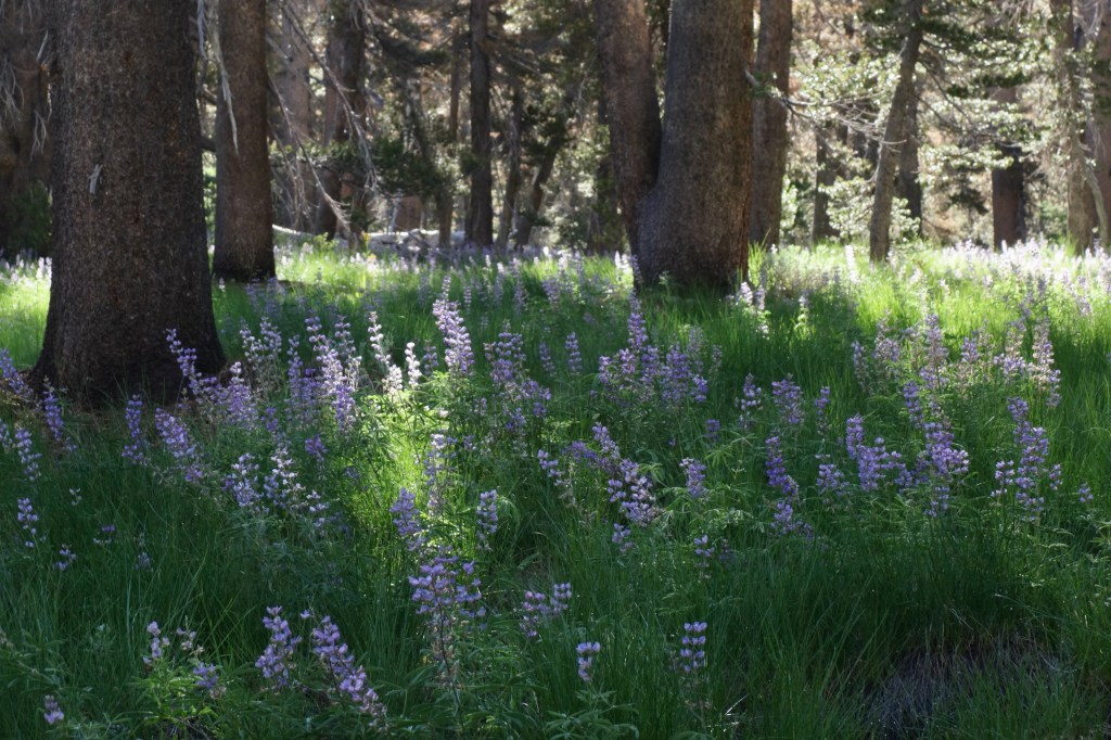 We hit the trees as the landscape leveled out. Widely spaced pine kept navigation straight forward and we made good time, aiming straight across the canyon to the left of a big mountain. I must have crushed hundreds of purple flowers on the way. Sage filled the air with it’s unmistakable fragrance.