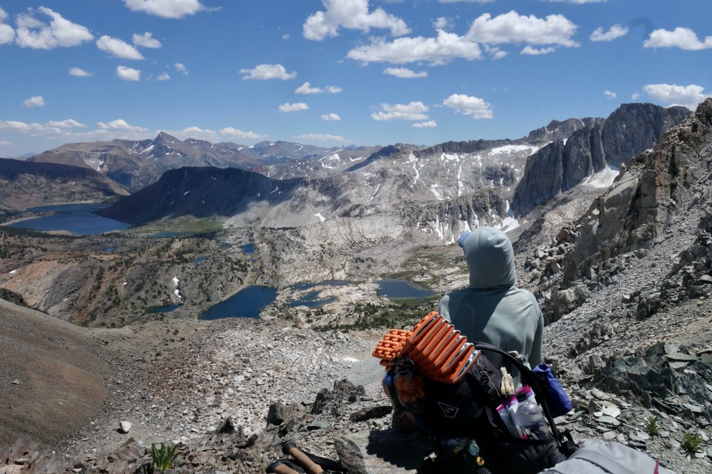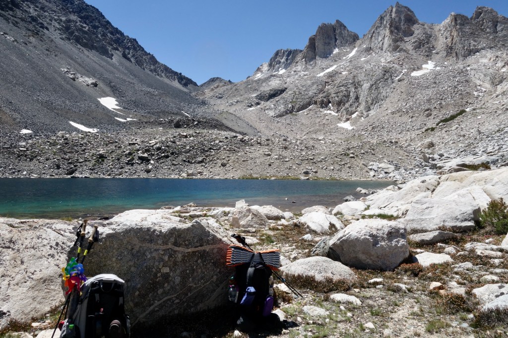 The rest of the day was benign by comparison. A scree slide down from Sky Pilot, then an easy descent on grassy benches to a basin of granite rimmed lakes. The water was warm and inviting, but we moved on by. Numerous tents dotted the landscape. It was strange to find ourselves in such a busy spot after such a tough day.