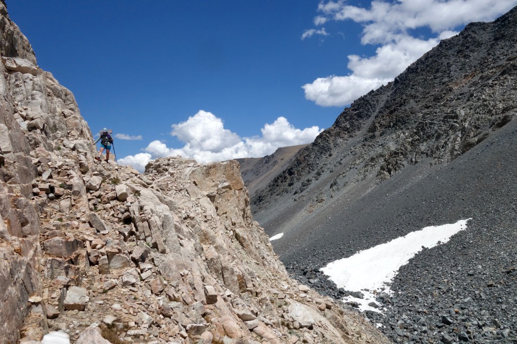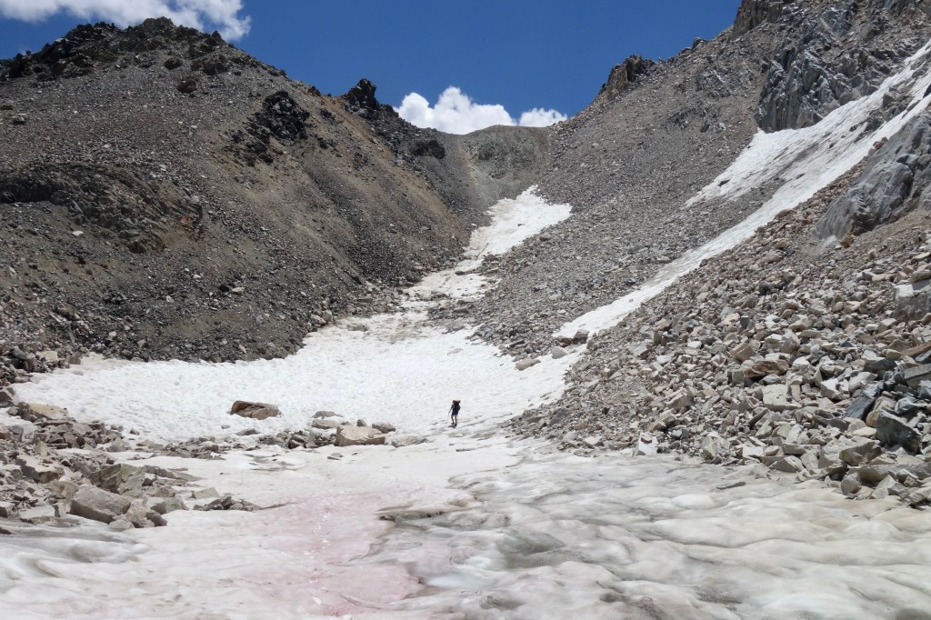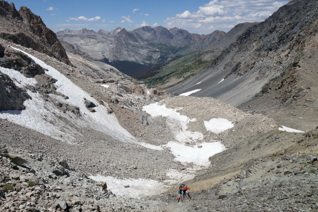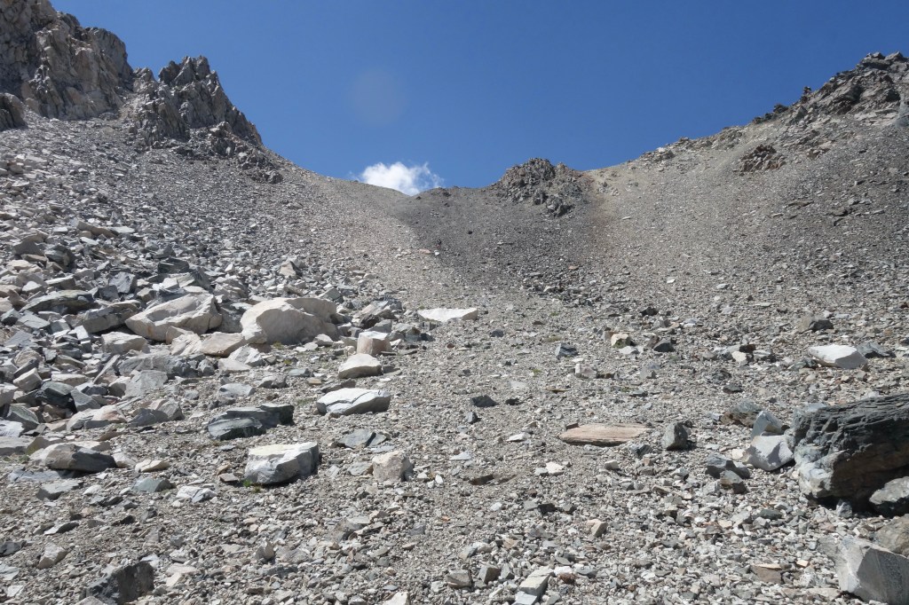 The climax of the day began with an offensive amount of talus climbing into a narrowing arena of crumbly rock. Like yesterday, we found ourselves too high and too far right, but it worked out without much trouble. The last couple hundred feet to the col gave me nervous shivers. It looked steeeeeep, with no friendliest choice obvious from the bottom. To the right looked like amazingly loose small talus, similar to the stuff that so thoroughly freaked us out on Knapsack Col on the CDT. The left appeared to be super steep sand. Knowing how crappy Knapsack was for us, I pushed for sand.