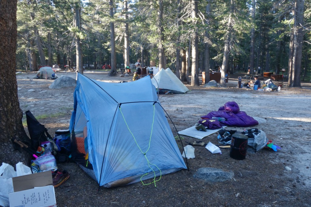 We spent a warm night in Tuolumne and I awoke dehydrated and puffy feeling from eating a salt bomb last night and sweating it out in my quilt during the night. Stifled in the tent, I felt much better in the relatively cool outside air. Spice and I packed up and returned to the glorious benches outside the Tuolumne Grill. We finished up our town food for breakfast (coffee soy milk and chana masala) and dropped some extra food in the hiker box, while hanging out with some dirty PCT hikers.