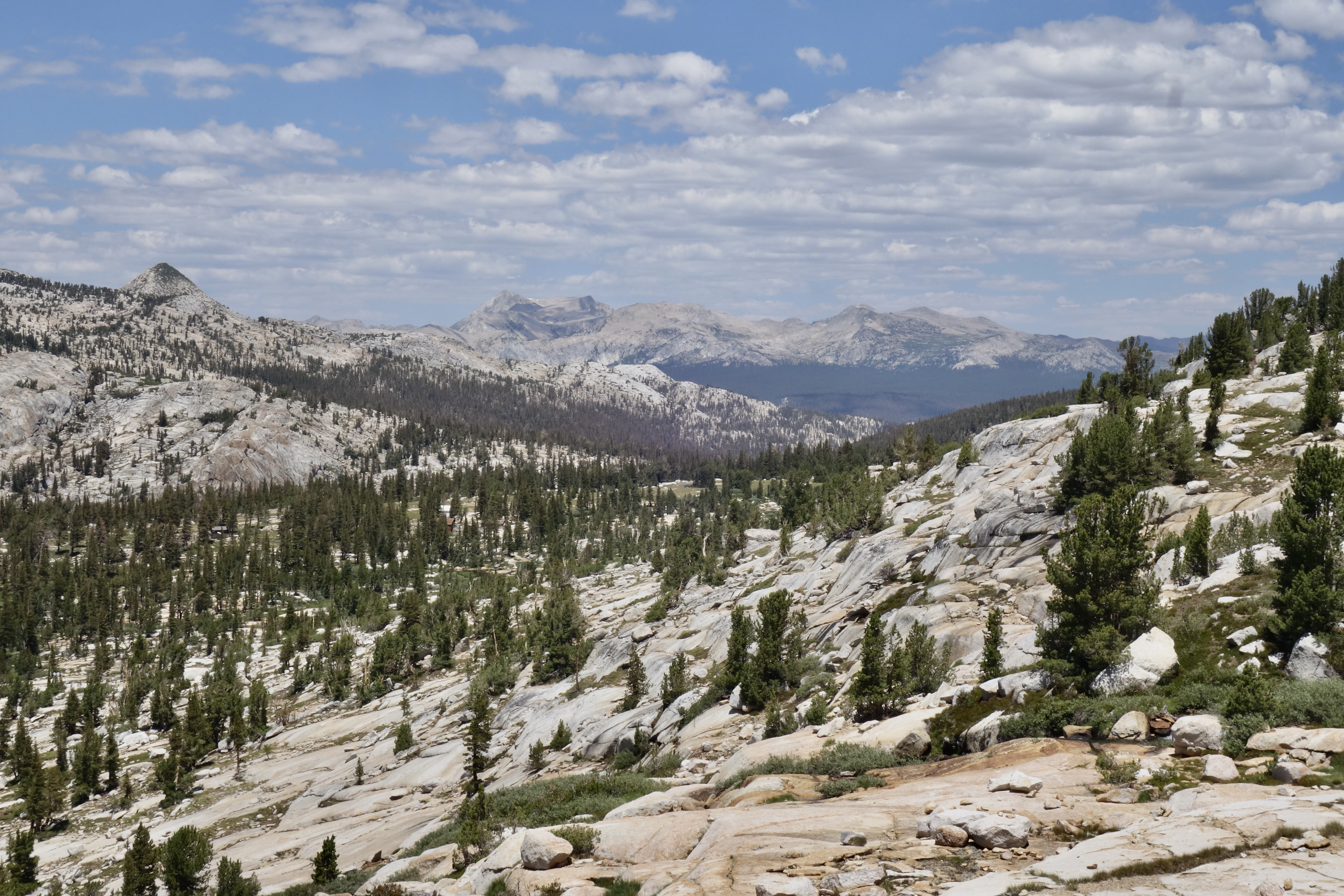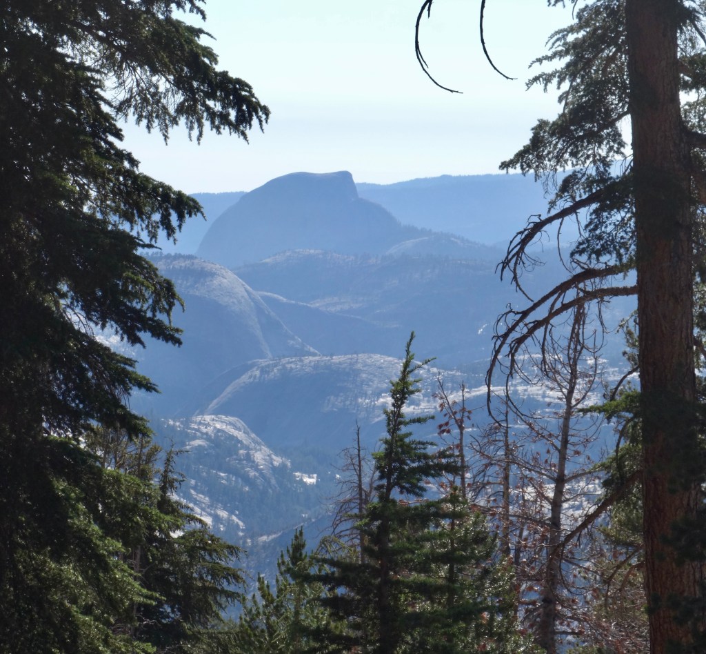 We carried damp shirts and pleasant memories up the Isberg Pass Trail, gaining back all the elevation we had just lost. The effort was large, but it was worth it to gain a fresh breeze and views. My legs were gassed by the time the trail flattened out in a forest of widely spaced trees dispersed across sandy dirt. To push through the part of the day where our legs and feet feel like tree stumps, Spice regaled me with the plot to Coyote Ugly, and I tried to explain Lord of the Rings to her. Either her stumps finally grounded their roots or because she really hates LOTR, we stopped the trail grinding at a granite bench with a stupendous view across the Merced River drainage to the mighty Clark Range. Big mountains, including Half Dome sit perched on our dashboard.