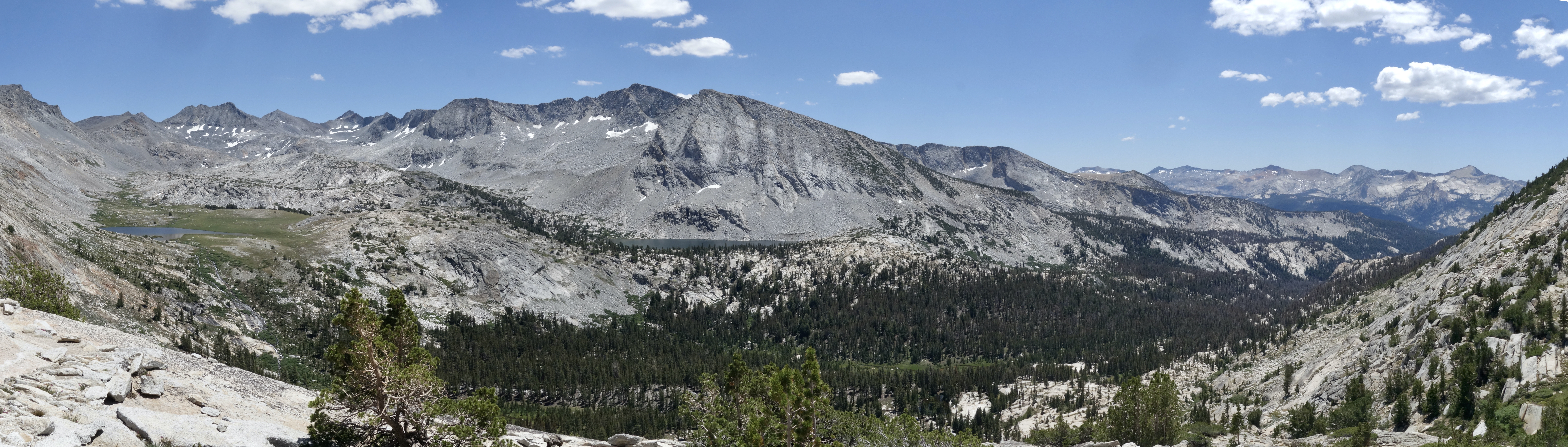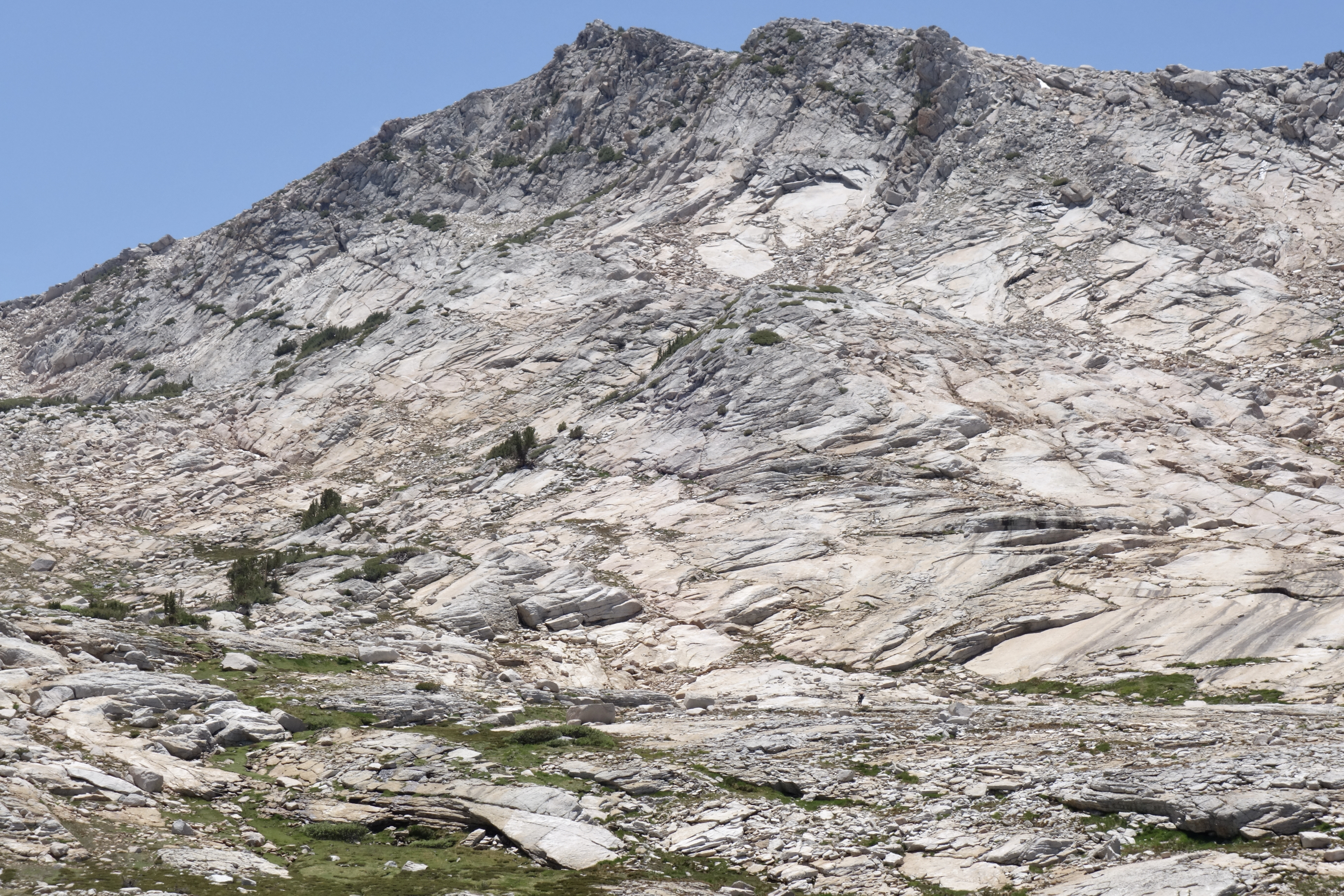 The day was heating up, so we dunked our shirts in the nearby creek for a little A/C on the climb up to Vogelsang Pass. The beauty was nuts. Rounded granite mountains filled in the widening foreground, the backside of Half Dome and the high peaks of the Conness group bounded the land against a cloudless blue sky. To keep juices flowing, I sucked individual Skittles until I caught up with Spice at the pass. The views south were equally impressive. More granite ahead, and the multicolored peaks of the Clark Range spread to the west.