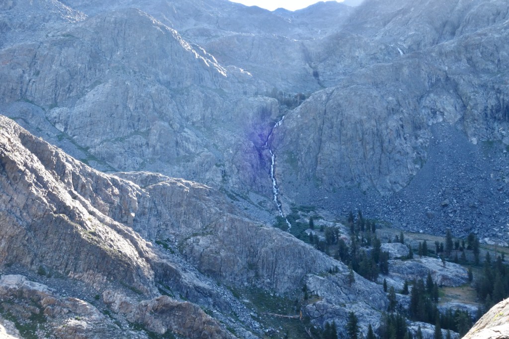 And it was hard, but also fun and engaging. A talus traverse got us to an overlook of the first huge waterfall. Mist floated away from the cliff, turning golden in the Sun’s backlighting. From there, a crack in the cliff allowed us to zigzag up a narrow ramp of brush to the flat meadow on top. It was a beautiful place that was completely invisible from below. Some trees for shade, wildflowers everywhere, and life chirping and buzzing like electricity. One waterfall down.