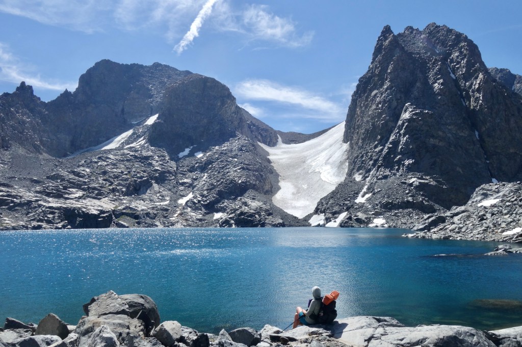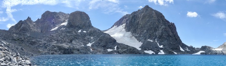 Just a few hundred feet below the pass, we found ourselves on the shores of Lake Catherine, resting in a wide basin of Rocky crumbles at the base of the sheer faces of Banner and Ritter. A glacier hugged the notch between them. The lake was bright sapphire, the only color present besides the blue sky in this arena of rock and ice. This was a special place. Spice and I both felt it. We filtered water and sat for a few minutes, watching the wind ripple in waves across the huge lake. Now this place really did feel like a different Sierra. More like the Alps than Yosemite. Many minutes later, we finished our climb with a traverse to North Glacier Pass, just above the lake. It had taken us four hours to go two and a half miles. That was alright with us.