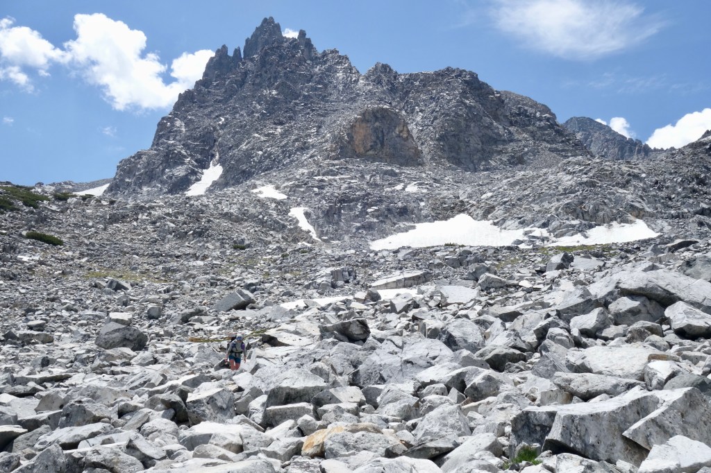 SpiceRack and I each slept hard. I awoke a little later than usual at 6am, feeling rested and recovered. Again I marveled at how well my body is putting the pieces back together again while I sleep. We were packed up and moving again by 7am, the hot sun already blasting down on us from above the high ridge of Banner’s northeast ridge.