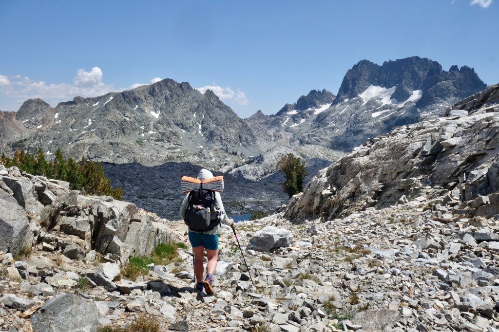 A mighty wind whipped us down the other side. At first, I was disheartened to see a mile of talus ahead of us, but it went quickly. Soon we were strolling down a grassy valley on a light use trail, passing hikers going up to the pass from Thousand Island Lake. We caught a view of this gem from a lump high above during lunch. We each recounted stories from our PCT hikes, which touched the opposite shore.