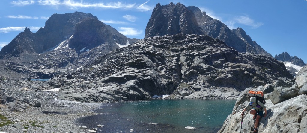 The heat was oppressive as we made our way around the western shore of Thousand Island towards an unnamed pass. We dunked our shirts and hats in a warm puddle before the climb. Not much to note about the pass. Just more good views of lakes and the ever changing Banner and Ritter. I ate a caffeinated Clif Bar to get me through the afternoon lassitude before a small down then big up to Whitebark Pass.