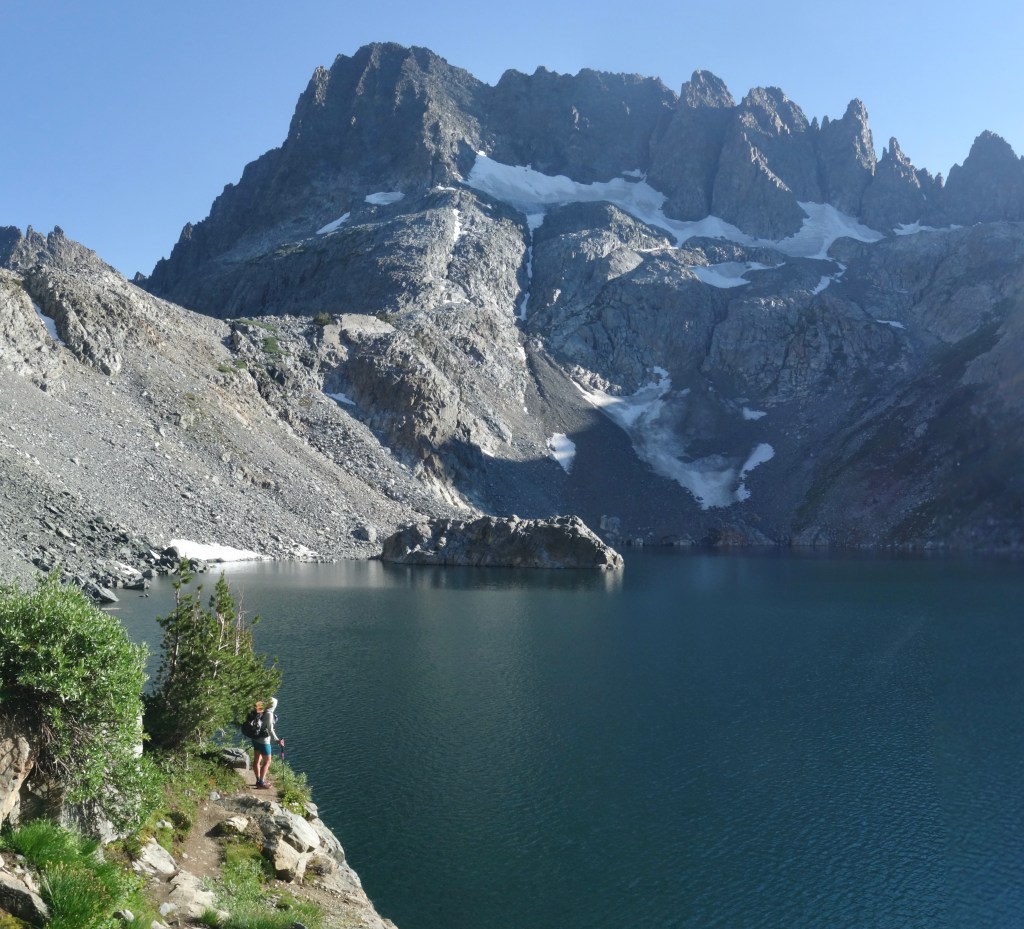 At Ediza Lake, we turned right up the trail to Iceberg Lake. Nestled at the base of the Minarets, it was a sight to behold. Good enough for camping. But we had more lakes to see, so we followed the rugged use trail around the eastern shore, slipping and sliding up to Cecile Lake, even better than Iceberg.