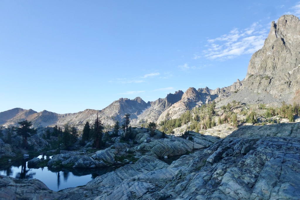 Disrobed and feeling fresh, we left the trail at the lake outlet to made our way to what our guidebook described as an “inconspicuous saddle.” That might not seem like a lot to go on, but it was obvious. Around the bottom of the lake, the views of the Minarets were stupendous, and then were gone as we dipped into the trees. Mosquitos lay in ambush and swarmed us in the cool shade. We caught relief on the saddle where we picked out our route across a small valley to and up Nancy Pass, the last of this section. It looked straight forward. Not nearly as confusing as the guidebook made it sound. But I guess that’s the point of the guidebook.