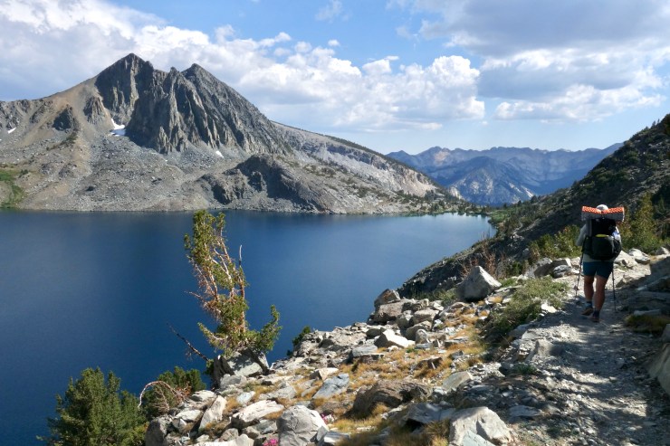 Before long, we were back on wide and amazingly well maintained trail around the lake. With clearing skies, the huge lake was a deep sapphire, truly a gem of the Sierra. A little later, we switched packs to try on one another’s aches and pains for a while. With Spice’s pack on, I felt as if I was being stretched over a barrel, but it was a welcome relief from my poorly packed and lopsided lump. We both committed to doing a better job packing tomorrow.