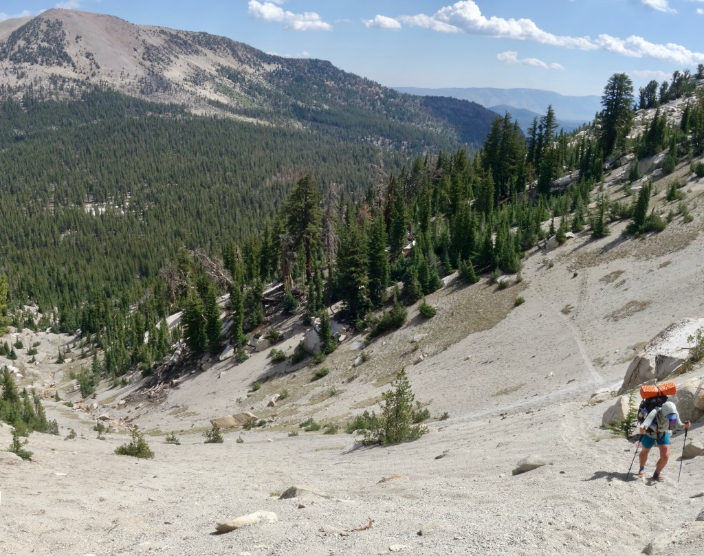 The sandy climb cut through an old burn zone, allowed the full force of the morning sun to bear down on us. To battle back, Spice pumped Taylor Swift’s Lover album from her tiny phone speakers, which gave me all the reason I needed to keep up. Back in the trees, we finished the gradual climb to a wide, forested saddle. Glimpsing through the trees I could see our objective. Mammoth Crest loomed above, a steep sandy slope cut between cliff faces. Our business was on top. Our business was with the sandy slope.