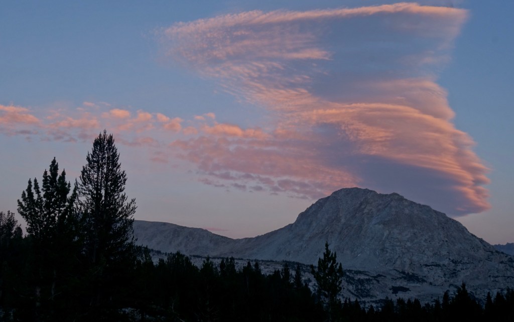 Spice tucked into bed at 6:30pm, pretty darn early by just about any standard that I can think of. I’m pretty sure that even 6-year-olds get to stay up until 7pm. With nothing left to do, but go to sleep myself, I found a rock that perfectly mimicked a reclining chair and watched the shadows lengthen and mosquitos thicken. At sunset, I was treated to the spectacular phenomenon called the Sierra Wave, a special cloud formation that occurs over the crest when conditions are right. It was cool for sure.