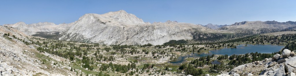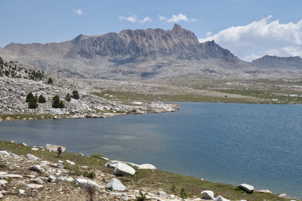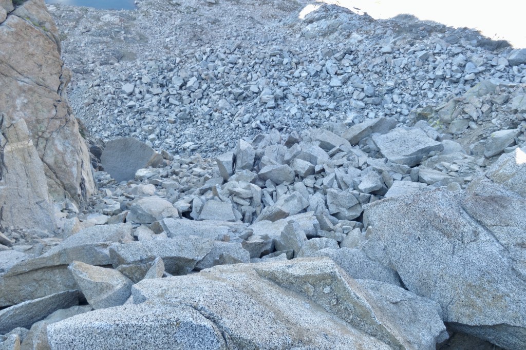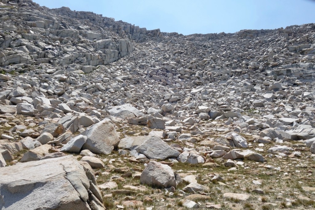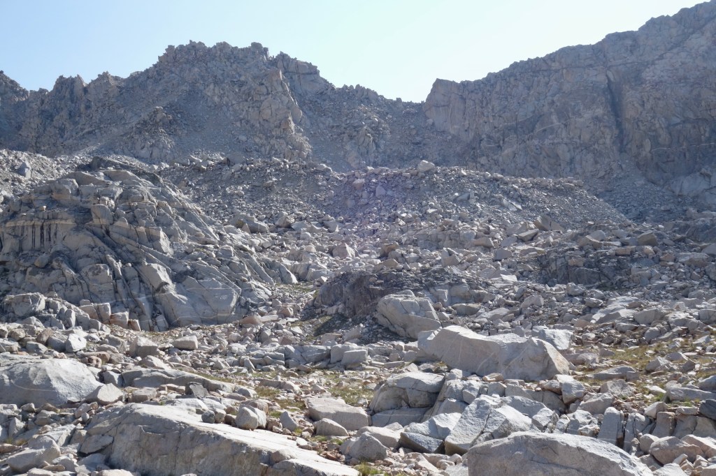 We had a great swim and lunch along the sandy shores of Mesa Lake, then continued the easiest of cross country travel towards Paiute Creek. From there, we identified with certainty our pass. Man, it looked scary. We were ready for our biggest challenge since Sky Pilot Col, but that didn’t make looking at it any less intimidating. The crumbly pile of sand and boulders looked darn near vertical. We knew to expect a mess of very unstable material, which would make for some unnerving travel. Even the approach to the hard stuff looked arduous. A couple miles of boulder hopping would test our ankle flexibility long before we even got to the good stuff. There wasn’t anything left to do, but go for it.