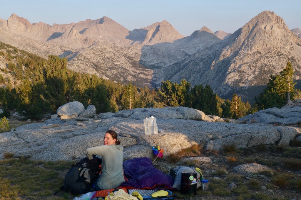 The gentle stroll down the valley through fields of purple flowers was just what we needed to calm our frayed nerves. While I gathered water, Spice found the best campsite in the whole wide world on our bench above Evolution Valley. We set up to cowboy camp were treated to not one, but two alpenglow shows on the peaks of the Evolution group. A lot of beans and Oreos for dinner to celebrate being alive and handling one of our biggest obstacles with style. Life feels a little brighter.