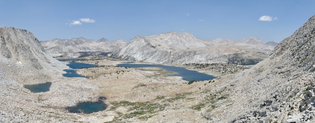 The final two thirds required care, but was more stable and less sandy. 30 minutes after starting, I hauled myself over the lip of the pass, into the bright evening sunshine. We hugged and tried not to look back the way we came. Fortunately, the way down on the other side looked straight forward, just some classic SHR benches. Far below, and looking beautiful was Frazier Lake, our stopping point. I gave Snow Tongue one last terrible look, then followed Spice down.