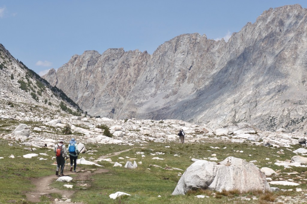 Despite this newly appreciated challenge and way more people than we’d seen since Virginia Lake, the Evolution Basin reminded me of just how ridiculously gorgeous the Sierra can be. Evolution and Sapphire Lakes, ridiculous. The soaring granite walls and spires of Mount Darwin and Haskell, just totally freaking nuts. Delicate cascades braiding through grassy meadows looked worthy of the most careful landscaping. It was amazing to me to think that all this beauty was just sitting there, that it had just happened that way randomly, like the piles of talus that we’d been scrambling over for days. Even though I’d been here twice before, I was floored and already thinking of ways to return.