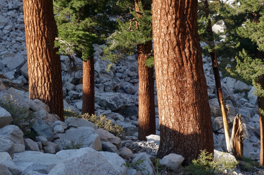 Golden morning light on the peaks of the Evolution region was a pretty sweet sight to behold first thing in the morning from the comfort of my quilt. Somehow we had made it through the night without getting eaten alive, and this tentless view was quite the reward. Even my struggles at making tea couldn’t bring me down. Taking initiative for once, I burned a hole in my sleeve, then spilled the entirety of our large mug onto the pine needles. With careful coaching from SpiceRack, my second attempt caused no harm, but there’s one more reason I don’t backpack with a stove. Incompetence.